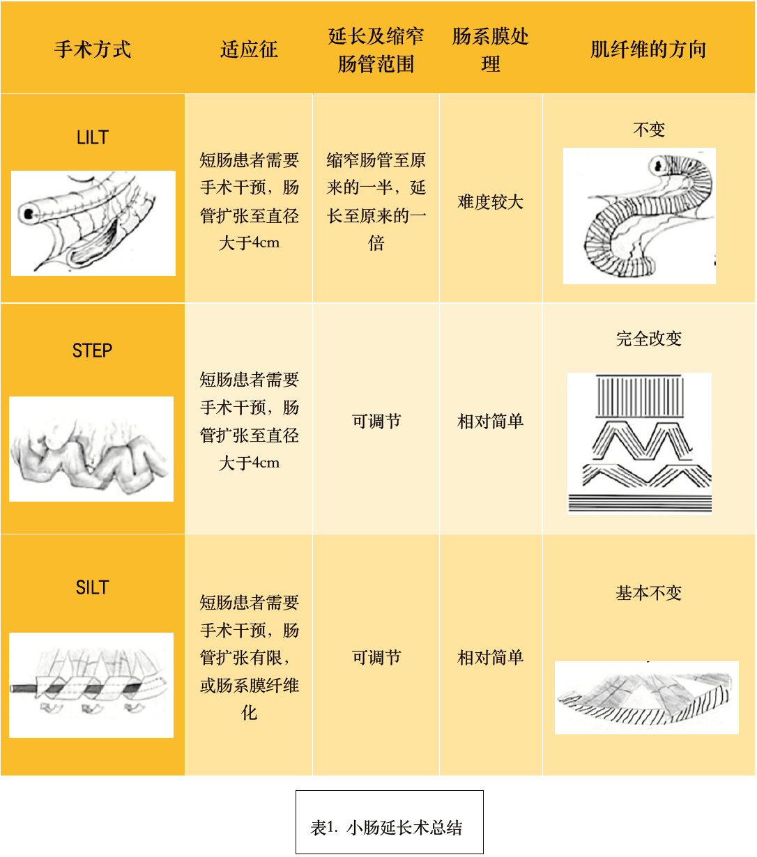 下面这个表格(表1)简单总结了一下今天介绍的术式。看得出来,针对短肠综合征的手术方式近年来不断创新,术后摆脱或者减少肠外营养依赖的概率较高,是治疗短肠综合征有效方式。小编还是忍不住要叨叨一下,肠康复治疗、肠外营养支持是治疗短肠综合征必不可少的环节。短肠患者首先要恢复肠功能,然后再做延长肠管的手术,才有意义。如果反复出现TPN不耐受、TPN并发症、中心静脉血栓、肝功能衰竭、超断肠综合征等等情况,那么光延长肠管是不够的,针对不同患者的具体情况,需要考虑小肠移植。