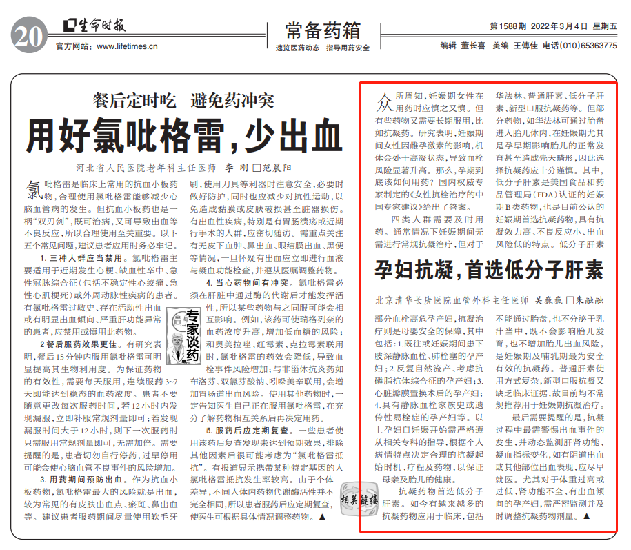 最后需要提醒的是,抗凝过程中最需警惕出血事件的发生,并动态监测肝肾功能、凝血指标变化,如有阴道出血或其他部位出血表现,应尽早就医。尤其对于体重过高或过低、肾功能不全、有出血倾向的孕产妇,需严密监测并及时调整抗凝药物剂量。▲