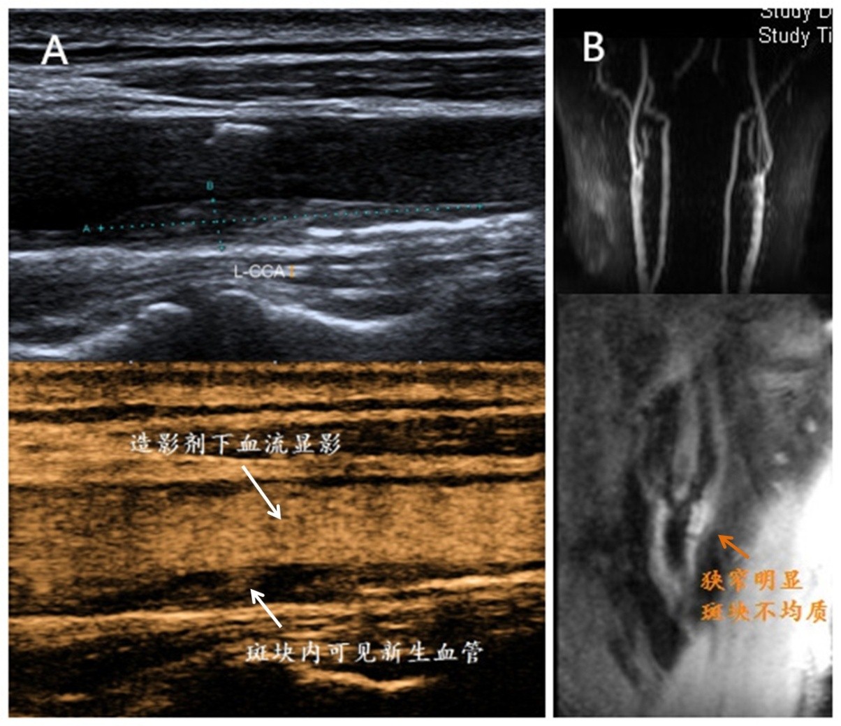 图2 超声造影(A)与磁共振斑块分析(B)均能有效评估颈动脉斑块稳定性