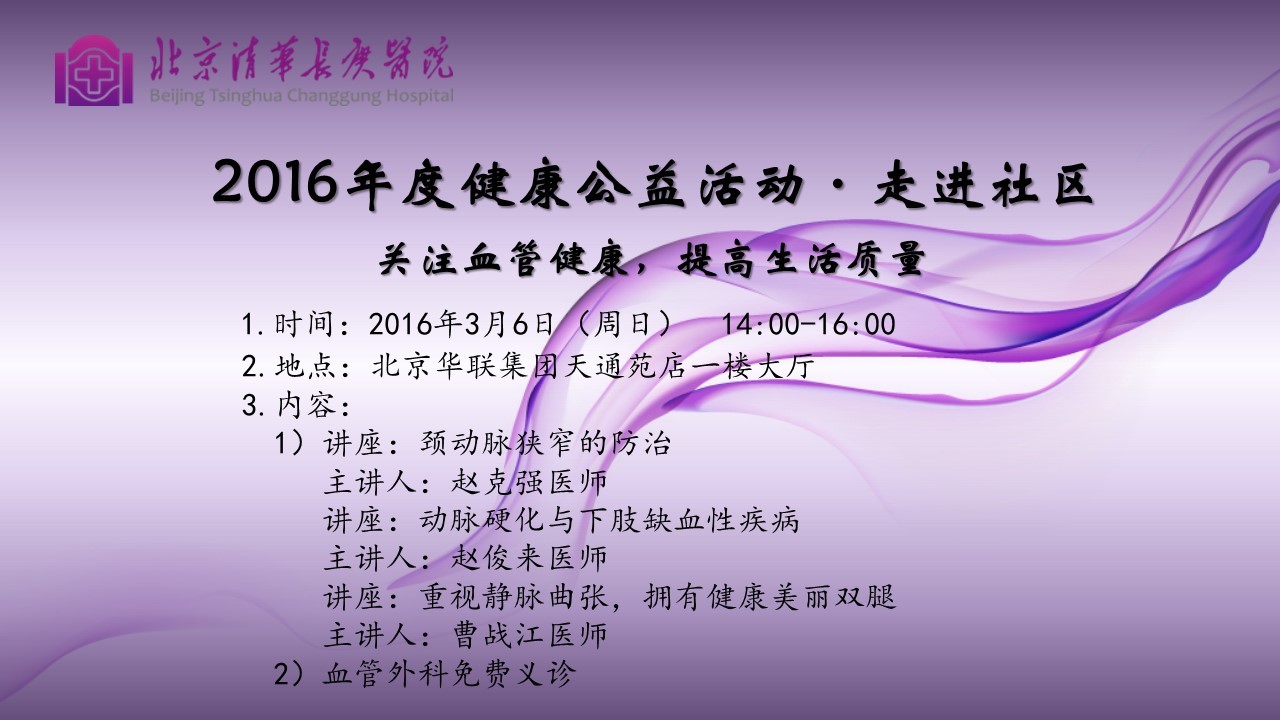 北京清华长庚医院血管新年首场健康科普和义诊活动----“关注血管健康,提高生活质量”于3月6日下午2:00-4:00在华联商场天通苑店一层举行。血管疾病是近二十年我国居民健康的首要威胁,正确认识和及时发现血管疾病,维护血管健康,提高生活质量。北京清华长庚医院血管外科将为居民讲授如何通过预防、早期识别及应对血管疾病,并有关问题将进行着重科普和解答,现场为居民义诊、发放血管外科主编的科普书籍。以下是活的内容。欢迎大家参加。