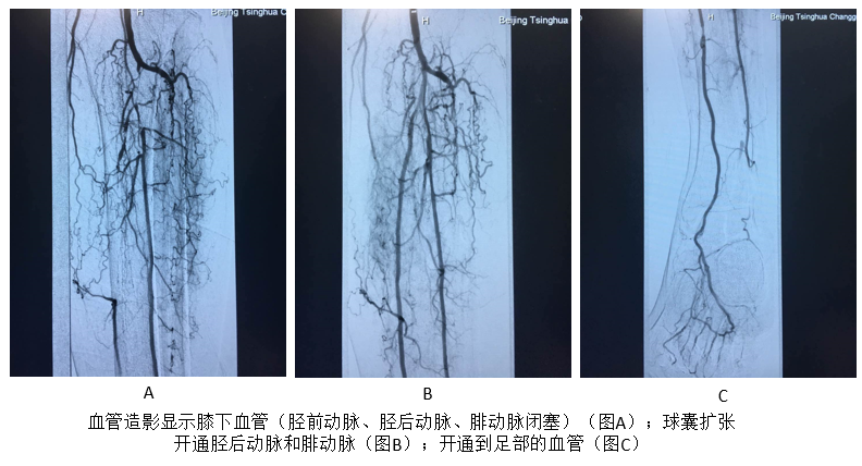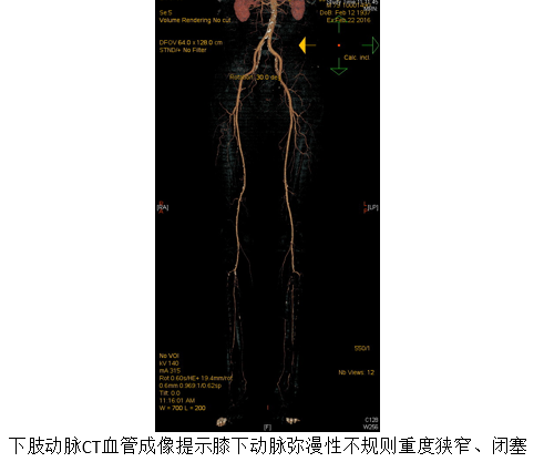 清华长庚医院3月14日电(血管外科 曹战江)王老先生患糖尿病10多年了,近半年出现了行走几百米后双下肢乏力、疼痛,因为下肢的疼痛不得不停下来休息一下(这种症状叫做间歇性跛行,提示下肢缺血的可能)。最近一段时间症状更加严重,跛行距离缩短至50米。于是就诊北京清华长庚医院血管外科吴巍巍主任的门诊,吴主任给患者做了详细的检查,发现该患者双下肢皮肤温度降低,摸不到双侧的足背动脉和胫后动脉搏动,踝肱指数(ABI)仅为0.3,下肢动脉CT血管成像(CTA)提示膝下动脉(胫前动脉、胫后动脉)弥漫性不规则重度狭窄、闭塞。吴巍巍主任评估该患者情况后,决定实施微创的腔内治疗,及时开通闭塞的血管,避免下肢出现皮肤溃疡,甚至坏疽。