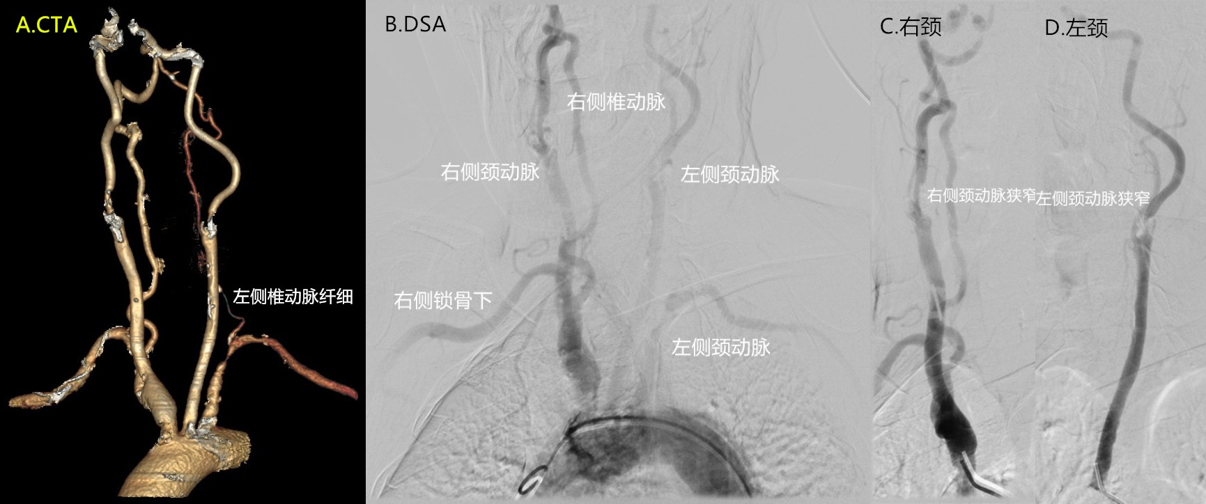 图4 CTA及DSA见颈部各动脉多处严重狭窄
