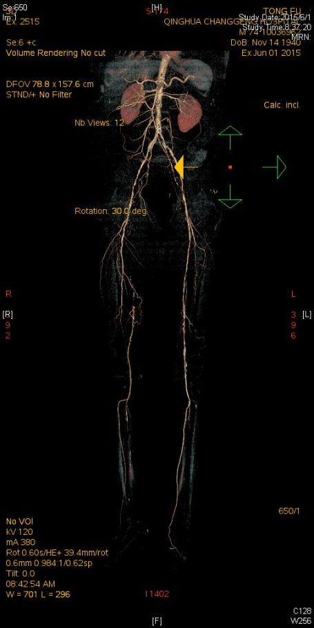 术前的下肢动脉CT血管成像检查可见右侧股浅动脉长段闭塞、左侧股浅动脉长段狭窄