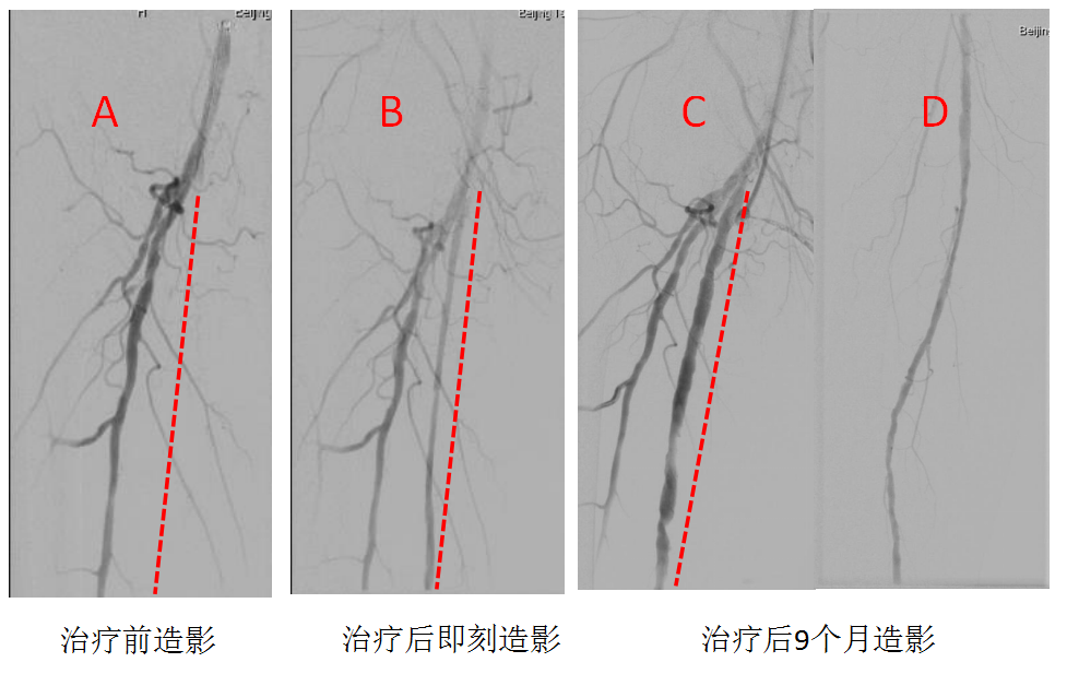 (A:治疗前造影显示右侧股浅动脉长段闭塞;B:治疗即刻造影显示闭塞病变血管已开通;C、D显示治疗后9个月造影显示血管仍保持通畅)