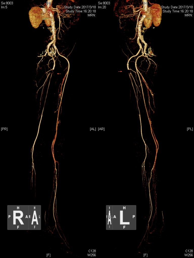 术前CTA检查可见右侧股动脉血栓形成,血流中断。