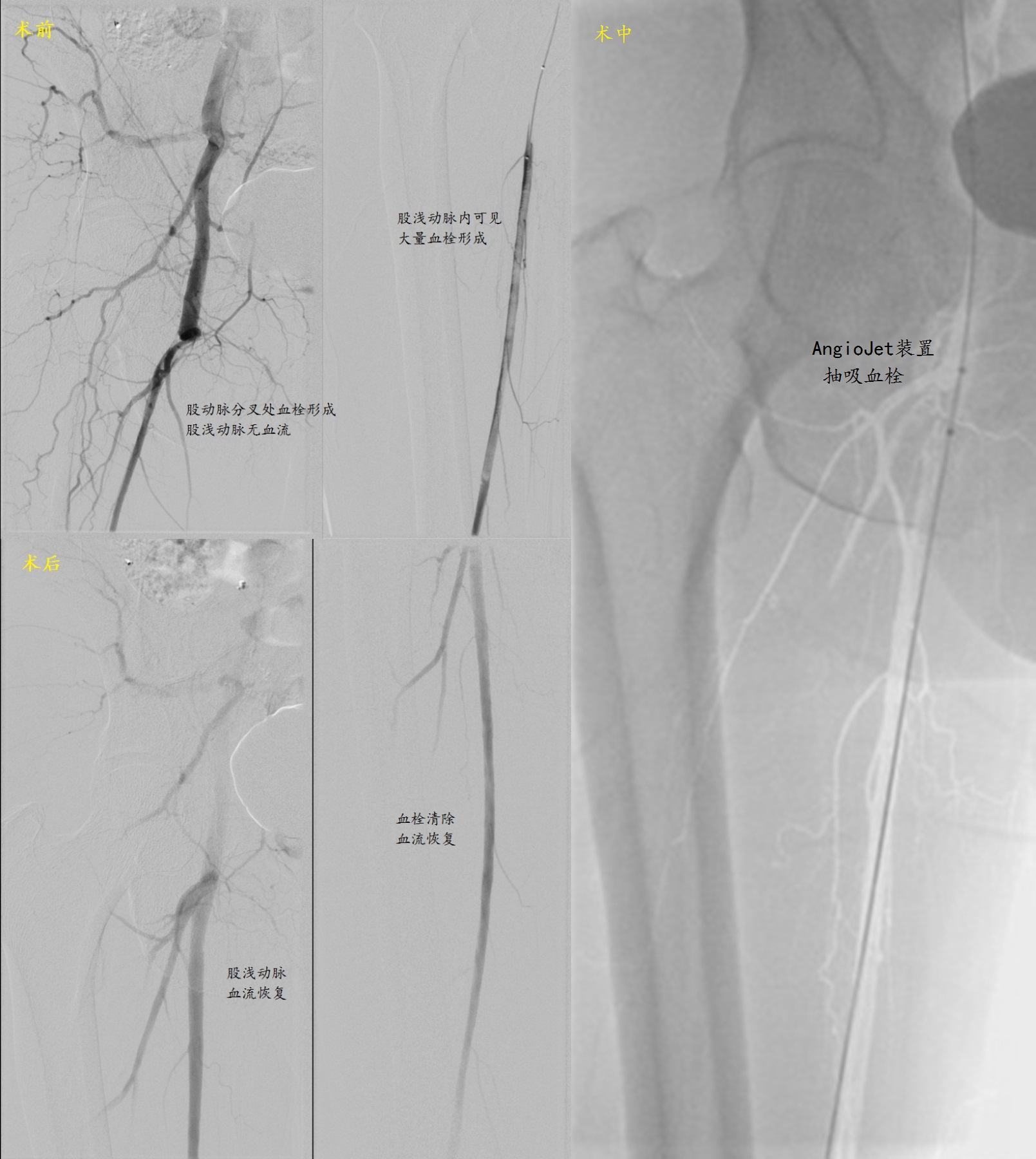 患者李伯伯1天前突发右下肢发凉、麻木,颜色紫绀,下肢动脉超声及CT造影检查明确为右侧股动脉血栓形成。股动脉是向下肢供血的主干动脉,急性缺血可导致下肢坏死。北京清华长庚医院血管外科团队使用AngioJet技术顺利抽吸动脉血栓,恢复血流供应。