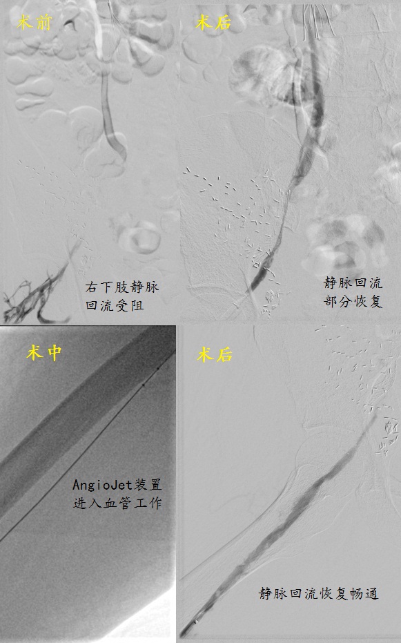 患者花婶既往直肠癌,手术后化疗期间突发右下肢肿胀,静脉脉超声提示右侧髂静脉-股静脉血栓形成。髂静脉及股静脉是下肢血液向心脏回流的主干静脉,血栓阻塞导致回流障碍,下肢严重水肿。北京清华长庚医院血管外科团队使用AngioJet技术顺利抽吸静脉内血栓,恢复血液回流。