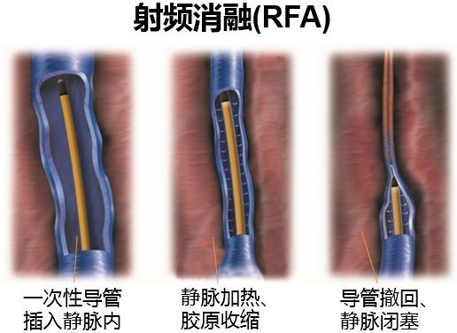 射频手术首先在膝盖内侧处将射频导管经皮肤穿刺入大隐静脉主干,导管将热能传递至静脉壁使病变静脉闭合;而对于小腿上曲张的静脉血管,我们进行局部剥脱结扎处理;必要时联合泡沫硬化剂治疗网状静脉、下肢曲张静脉以及交通支静脉。整个手术治疗仅有几个不到半公分的切口和一些小针眼。