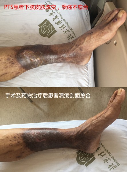 PTS表现为肢体沉重不适,久站或活动多后加重;肢体肿胀,肌张力增大,浅静脉扩张,小腿足靴区色素沉着、皮肤增厚粗糙、瘙痒、湿疹样皮炎,形成经久不愈的或反复发作的慢性溃疡。严重影响患者生活质量