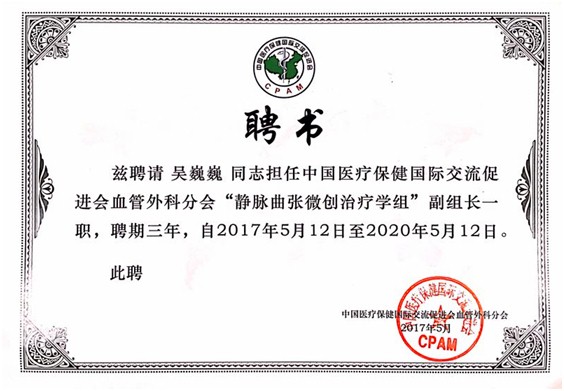 图4吴巍巍主任受聘为中国医促会静脉曲张微创治疗学组副组长