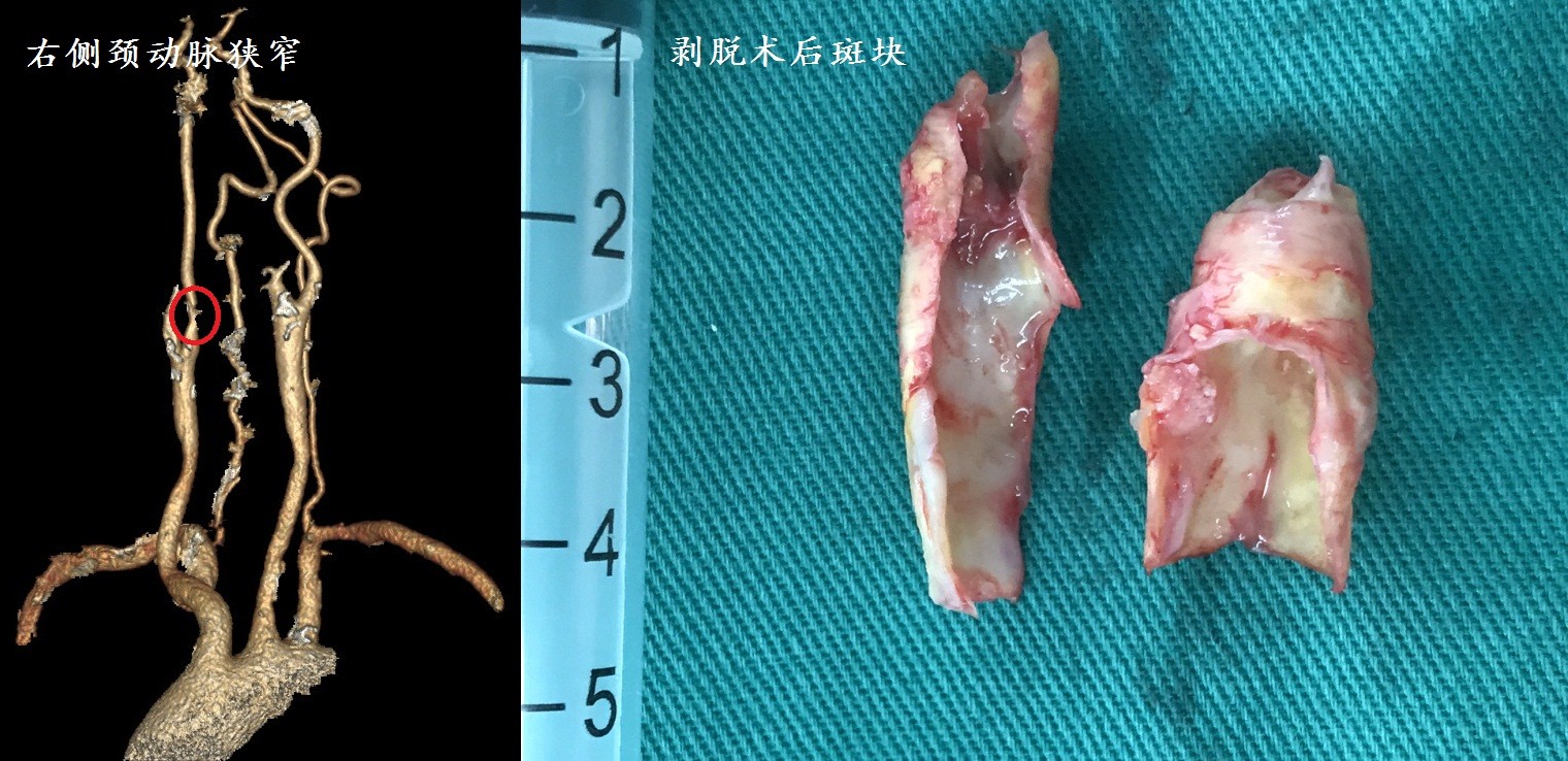 清华长庚医院9月25日电(通讯员 杨宇 吴巍巍))老黎今年60岁,糖尿病20余年,1个月前突然出现左上肢麻木、握持无力,老黎有脑梗塞的家族史,立刻想到有可能是“小中风”发作,赶紧就诊清华长庚医院神经内科,医生发现老黎的右侧颈内动脉起始端粥样硬化斑块形成、重度狭窄(如图),超声造影检查及颈动脉斑块MRI分析均提示不稳定斑块,极易脱落导致脑梗死。老黎迅速转入了血管外科病房,吴巍巍主任团队经过仔细讨论分析病情,考虑老黎颈动脉斑块极不稳定,决定为老黎实施颈动脉内膜剥脱手术,并决定术中联合神经内科医师予以经颅多普勒监测大脑中动脉血流,保证手术精准安全。经过术前仔细准备,血管外科吴巍巍主任、赵克强教授在麻醉科医师的保驾下为老黎安全施行颈动脉内膜剥脱术,从颈动脉分叉处取出了一块长约2.5cm的淡黄色厚实斑块,斑块内表面不光滑,符合不稳定斑块的特征,避免了老黎发生严重的脑梗塞。经过CCU团队与血管外科团队严密监护控制血压,老黎在术后1周顺利康复出院。