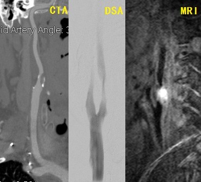 颈动脉彩超检查能够做出初步判断,但其受检查技师操作经验及主观判断影响大。为了进一步指导手术治疗,还需要明确颈动脉狭窄部位、长度以及程度、斑块成分等详细信息。颈动脉血管造影(DSA)能准确检查出动脉狭窄的程度和范围,是诊断动脉病变的金标准。近年来,应用超声造影、CT血管增强(CTA)以及磁共振斑块分析(MRI)等技术,同样可以得到全面的动脉狭窄信息,通过三维建模从不同的角度显示血管结构,良好地识别不稳定斑块。