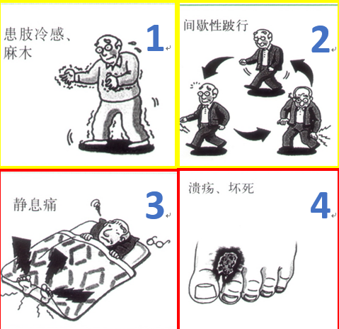 专业的诊断叫“下肢动脉粥样硬化闭塞症”、“糖尿病足”,“粥样硬化”就是对动脉管壁附着斑块的形象描述,好似下水管道污垢沉积堵塞管道。其实这些斑块并不那么“弱不禁风”,反而像条顽固贪婪的“毒蛇”,潜伏在血管阴暗的角落里吞食着血液营养日复一日不断生长蔓延,导致血管腔狭窄,出现下肢缺血症状,如下肢间歇性跛行、疼痛、发凉、麻木、溃破发黑等症状(见图2)。特别是合并糖尿病的动脉硬化闭塞,一般有严重的钙化,血管闭塞很严重,一般的球囊扩张很难扩张充分,即使植入支架由于斑块负荷过大,也容易再次狭窄,症状复发,特别是纤细的血管如大腿根部以下的动脉,本身直径较细,再加上斑块堵塞管腔,支架很容易再次狭窄闭塞,严重时就会截趾、截肢甚至溃疡感染危及生命。