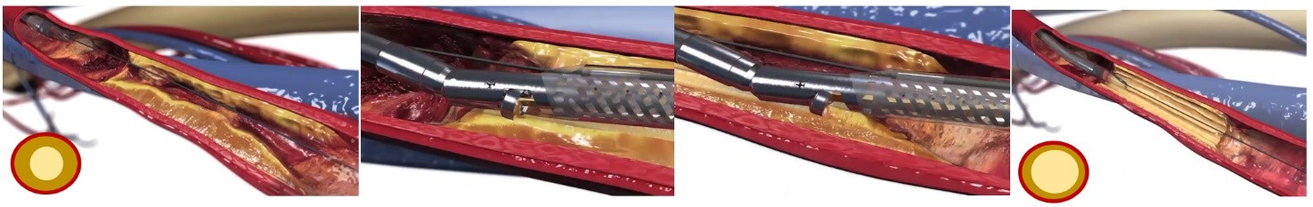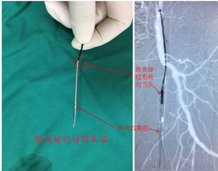 随着医疗技术发展,动脉斑块也可以通过先进的医疗器械精准清除,动脉管腔获得疏通,下肢获得新生。北京清华长庚医院就在国内率先引进了这种先进的医疗设备推广应用,获得了良好的效果,天通苑社区的王大爷就受益于这一新技术。春暖花开,万物复苏,王大爷本该像往年一样打打太极拳、参加社区组织的老年旅游活动,但最近并不开心,原来出现了腿疼的毛病,走个一两百米,小腿就沉重酸胀抬不起来,疼痛得不得不停下来歇十几分钟;近1个月,这腿的毛病加重了,不走路也有脚趾疼,夜间尤其频繁,一个踏实觉也睡不了,脚垂到床边或抱着脚才勉强缓解,坐在床上迷糊到天亮,每天靠吃社区开的止疼药度日。儿女和老伴劝了王大爷好几回,可他就是不愿去医院,原来在他心中有个结:隔壁高大爷是王大爷的老邻居,两家在一起交情很好,前年高大爷也是这样的症状,去了医院诊断为“下肢动脉粥样硬化闭塞症”,医生说腿上血管有斑块堵住了血运,建议用普通球囊扩张斑块(图3)然后置入支架,高大爷接受了这个手术,术后症状缓解了五六个月,可之后症状又发作了,再去医院检查发现上次置入的支架又堵了(图4),不得不再接受同样的手术,就这样反反复复每半年手术一次,钱花了不少,罪没少受,腿越来越细,脚趾头陆续发黑截掉,最后不得不在大腿中间做了截肢手术。这样一个发生在身边的惨痛经历让王大爷心存忌惮,对医院、医生和通血管手术即爱又怕,整日忧心忡忡。有没有一种办法可以开通血管,去除大部分斑块,避免植入支架,而又有很好的通畅率?事情在王老的女儿咨询了清华长庚医院血管外科门诊后出现转机,这个就是我们接下来要介绍的针对下肢动脉粥样硬化狭窄闭塞,特别是严重钙化斑块的微创精准治疗方式:斑块旋切联合药涂球囊技术(图5)。