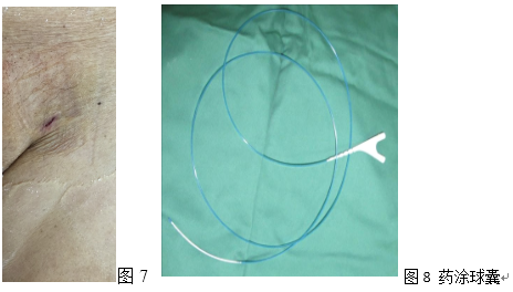 该治疗不仅可以直接清除斑块,恢复血流,而且是通过特别小的穿刺点实现的(图7),治疗后血管内不留下任何异物材料,最大限度地减少了术后血管内膜增生引起的再狭窄。腔内斑块切除术可以治疗腹股沟以下动脉病变,尤其适用于一些不宜植入支架的位置,如股总动脉、腘动脉及膝下血管等。