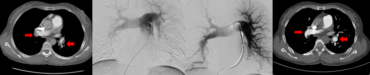 患者张某,女性,49岁,反复发作胸痛、憋气症状3年,1年前再次急性发作,就诊我院血管外科,诊断为肺栓塞、慢性血栓栓塞性肺动脉高压,肺动脉压力高达96mmHg。考虑患者复发肺动脉栓塞可能,经微创肺动脉栓塞腔内溶栓治疗后症状缓解,肺动脉压力降至70mmHg左右。此后患者坚持药物治疗,但仍有活动后喘憋等症状,近1年肺动脉压力逐渐升高至70-80mmHg,间断发作右心衰竭,最严重时6min步行距离只有不足100m,严重影响日常生活,时刻危及患者生命。(科普知识链接:“关于深静脉血栓和肺栓塞,我们不得不说的事”、“机械抽栓治疗急性肺栓塞——挽救患者生命的神兵利器”、“腔内治疗解除下肢静脉血栓后综合征”)