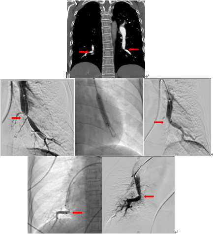 北京清华长庚医院血管外科团队在吴巍巍主任的带领下,联合麻醉科、心内科、呼吸科、重症医学科等兄弟科室,充分评估患者病情,明确患者手术指征,制定了详细的围手术期治疗预案,与患者及家属充分沟通手术的必要性及相关风险后决定采用肺动脉球囊扩张成形术治疗。这是血管外科在静脉血栓栓塞性疾病治疗中的又一次大胆的尝试,无论是医生或是患者均承担了相当大的风险及压力。2月19日在麻醉科的严密监测下吴巍巍主任、赵俊来医通过右侧股静脉入路,选择进入患者左侧肺动脉基底段狭窄部位,完成肺动脉球囊成形术,球囊扩张后肺动脉形态改善。患者术后在监护病房观察一天后顺利返回普通病房,患者恢复顺利。于2月25日再次行右侧肺动脉基底段球囊扩张。患者术后6分钟步行距离明显提高,术后2天即可行走450m,肺动脉压力由术前82mmHg降至68mmHg。患者顺利出院,由于双侧肺动脉病变广泛,此后还将密切随诊,择期再次行其余部位的肺动脉腔内治疗。