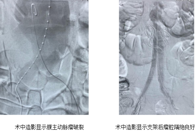 时间就是生命,急诊科、麻醉科、手术室、ICU在第一时间就位,兄弟科室迅速暂停导管室的常规手术,为绝急手术让路。术中,吴巍巍使用柔顺性较好的腹主动脉支架,充分利用支架锚定区,最大程度地顺应瘤颈的形状,建立血流新通道,并栓塞右侧髂内动脉,同时完全隔绝腹主动脉瘤和右侧髂总动脉瘤。支架植入后,吴主任还通过清华长庚医院血管外科团队在国内率先开展的“同期预栓塞微创治疗腹主动脉瘤”技术,利用预置导管向动脉瘤腔内填充弹簧圈与促凝药物,进一步加快瘤体中血液的血栓化速度,确保封堵彻底。患者迅速转危为安,术后患者恢复良好,2周后出院。