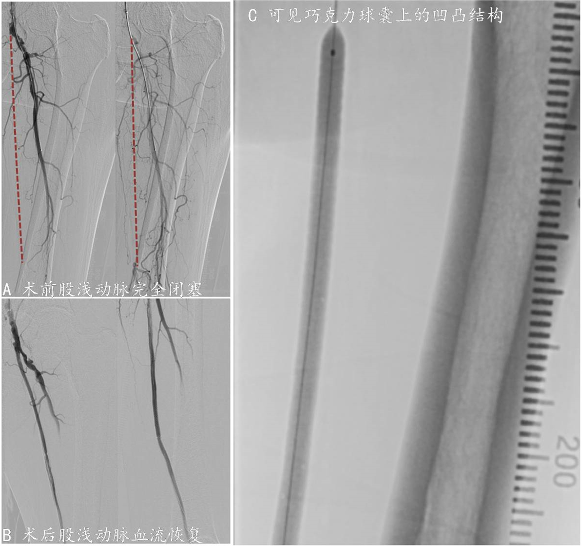 图3 巧克力球囊用于股浅动脉完全闭塞病变血管准备