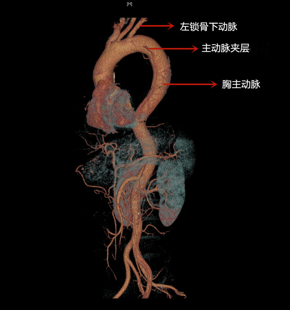 6月5日,崔先生总觉得后背疼,“像是有什么东西被撕裂开了”,疼痛感加重后赶忙来到清华大学附属北京清华长庚医院急诊。急诊内科医师马士程接诊后,了解到崔先生有多年不规律治疗的高血压、糖尿病史,结合症状,在排除急性心梗后高度怀疑为夹层动脉瘤。经完善主动脉造影(CTA)检查,果然证实了猜测——Stanford B型主动脉夹层。夹层蜿蜒曲折,像一条游龙潜在主动脉上,延伸到髂动脉。