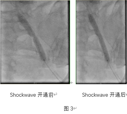 术中,通过细腻的导丝、导管操作,手术团队率先在左侧髂动脉打通一丝通道,通过血管造影,评估髂动脉及左下肢血流全貌;结合术前CTA检查,于髂动脉严重钙化狭窄部位通过Shockwave血管内冲击波导管,共发放6组血管内冲击波,短短几分钟,髂动脉血流完全恢复通畅,血管恢复柔顺,安全、有效、迅速地解决了下肢缺血的问题。