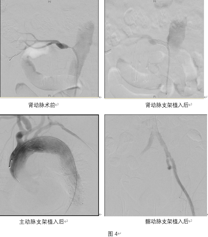 继续主动脉瘤“拆弹”手术,由于髂动脉入路血管恢复生理功能,主动脉介入操作顺滑通过,顺利完成了介入操作。术中,吴巍巍教授团队同时发现,该患者肾动脉多处狭窄,在一台手术中,为该患者完成了降主动脉、肾动脉、髂动脉等多处复杂血管病变“一站式”治疗。