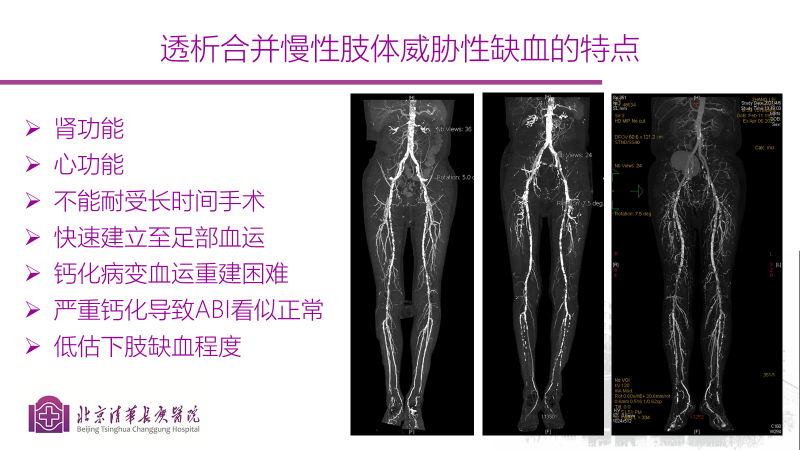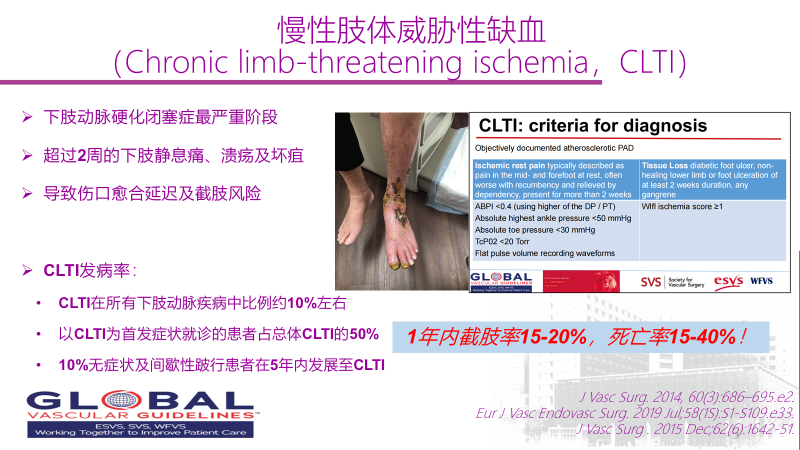 第二位讲者是是来自北京清华长庚医院血管外科的曹战江教授,他介绍了另一种威胁透析患者生活质量甚至生命的难治性疾病《透析合并慢性肢体威胁性缺血的治疗策略》。下肢动脉疾病是常见的一种慢性疾病,60岁以上发病率超10%,慢性肢体威胁性缺血(缩写CLTI)又是其中最为严重和棘手的阶段,1年内截肢率15-20%,死亡率15-40%。