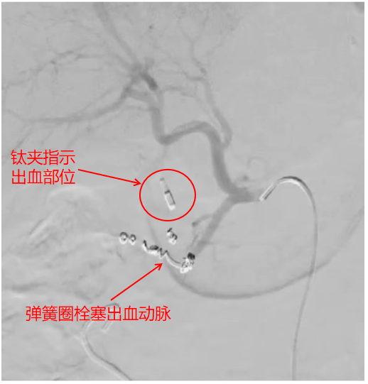 手术室就位后,患者因为失血性休克出现了四肢湿冷、烦躁不安、呼吸紊乱等情况。麻醉科主治医师王晓宇迅速建立中心静脉通路,为患者输血、补液,维持循环稳定,曹战江与医师李子澎上台,行股动脉穿刺,结合增强CT以及消化内科医师内镜下留置的钛夹定位下,很快定位出血动脉为胃十二指肠动脉的一条分支。