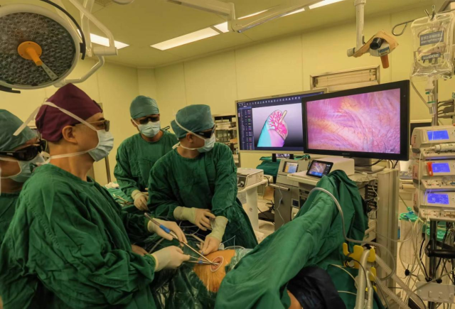 为解决手术定位难题,何建行自助研发了一种具有混合现实效果的“无痛无创定位技术”,可以利用精准三维重建技术结合术中3D高清腔镜系统、裸眼3D系统,让医生变成“透视眼”,患者无需经历术前穿刺或支气管定位,就能实现肺结节的精准定位、切除。经过与麻醉科的多学科讨论,手术团队决定利用该技术,同时以术中自主呼吸麻醉为两位患者实施无气管插管肺结节切除手术。
