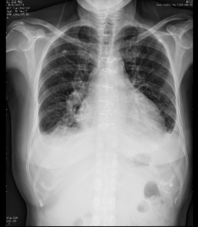 双肺渗出较前明显减少,心胸比:0.53,双侧胸腔积液消失。