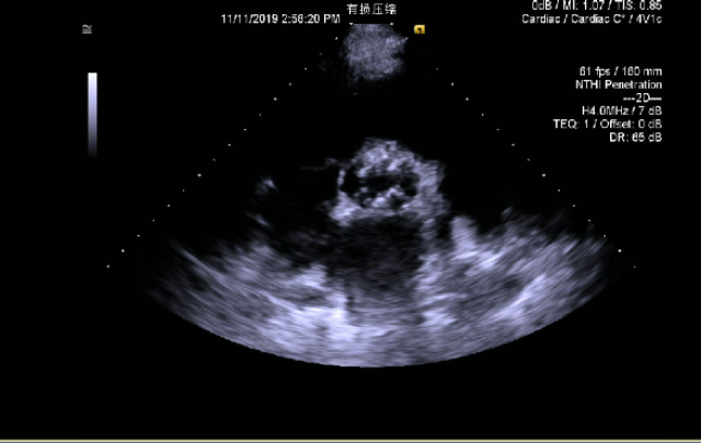左心增大,室间隔增厚,左室心尖部小室壁瘤形成,大小约15x12mm;主动脉瓣病变,二叶瓣不除外,重度狭窄(跨瓣压差58mmHg),轻-中度关闭不全;二尖瓣钙化,轻-中度关闭不全;三尖瓣中-大量反流,肺动脉收缩压增高,估测肺动脉收缩压约为52mmHg。主动脉瓣Vmax:510cm/s,左室射血分数减低,左室舒张末径: 59 mm,左室射血分数: 24 %。