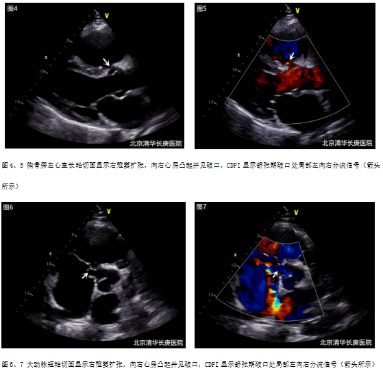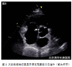 e.术后处理:返回CCU继续监护治疗,待神志、呼吸及循环系统稳定后撤离人工呼吸机(呼吸机辅助时间6小时),预防性静脉滴注抗生素3天,复查血象、胸片及超声心动图(图8),超声心动图重点观察主动脉窦形态、分流是否消失及各瓣膜功能等;