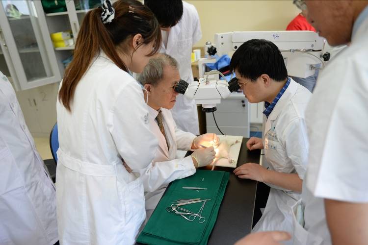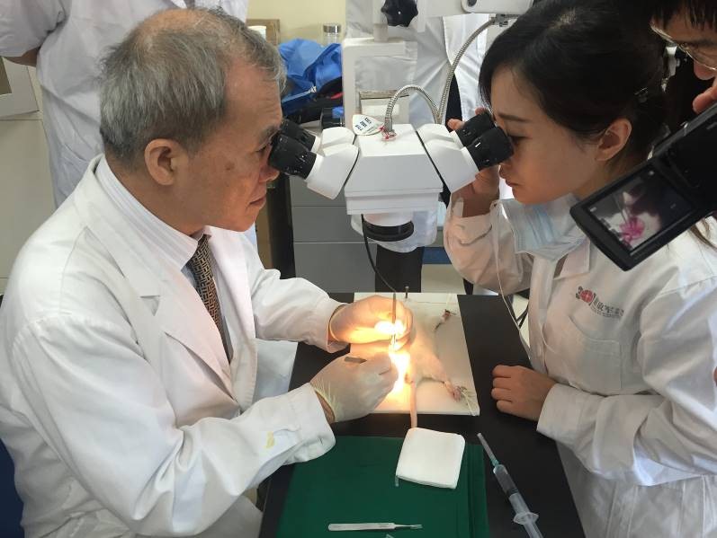 训练营开始前,陈宏基院长先向学员们详细的讲解了显微外科的基本理论与技术要点。讲解过程中,陈院长时而勾画图表详述,时而亲自操作演示,加深了学员对于显微外科理论的理解。接着陈院长播放了他自己专门为本次训练营学员录制的显微外科操作视频。最后陈院长亲自向每位学员详细演示了活体大鼠股动脉与股静脉的显微缝合,并对学员的操作给予手把手的指导和纠正。