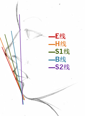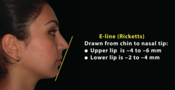 首先,这种方法并非空穴来风,理论依据源自整形外科以及颌面外科常用的E线,即在侧面观时,颏前点(也就是下巴最前突的点)与鼻尖点的连线,也称审美平面,是Ricketts在1968年提出的。作者认为,在嘴唇放松闭合时,上唇突点应在此线后方4-6mm,下唇突点应在此线后方2-4mm。此标准并不适用于所有人种,但E线因其简便易操作,从而成为临床中最为常用的评估鼻-唇-颏关系的方法。