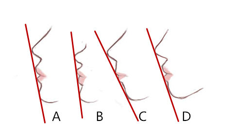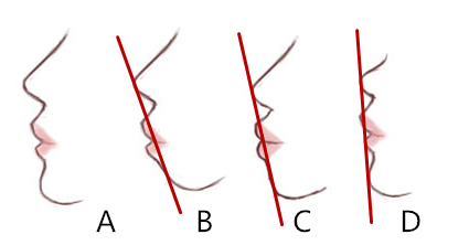 另一方面,以上图为例,如果鼻尖、嘴唇和下巴三者不在同一条线上,可能是由很多不同的原因引起。以嘴唇超过E线为例,大致可分为以下三种情况:图B所示为下颏后缩,图C为唇部前突,而图D则是由低鼻尖所致。所以,如果三者不在一条线上,也不能判断出到底是鼻、唇、下巴哪一部分出了问题。