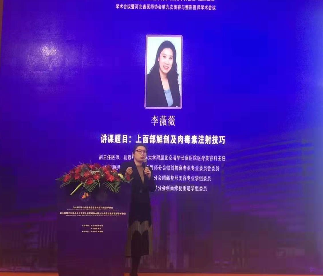 我科的李薇薇副教授在大会上讲授了《上面部解剖及肉毒素注射技巧》,李教授结合大体解剖照片、解剖模式图、超声影像图等资料,以上面部肌肉分布、运动为重点,详细讲解了上面部的解剖特点和临床应用,总结分享了肉毒素注射临床应用的原则、技巧以及并发症和处理措施,理论与实践相结合的讲课内容得到了参会者的一致好评。