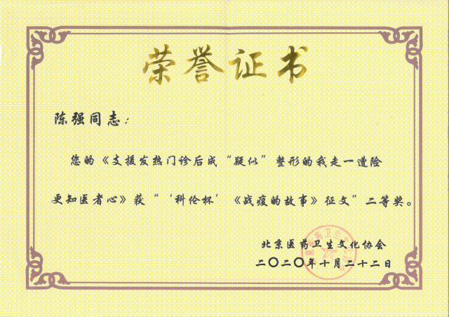 北京清华长庚医院2020年12月4日电(通讯员 韩冬野)近日,北京医药卫生文化协会举办的“科伦杯”《战疫的故事》征文比赛公布获奖名单,在全国投稿的600多篇稿件中,我院整形外科陈强医师执笔的“支援发热门诊后‘疑似’整形的我走一遭险更知医者心”获得了二等奖。