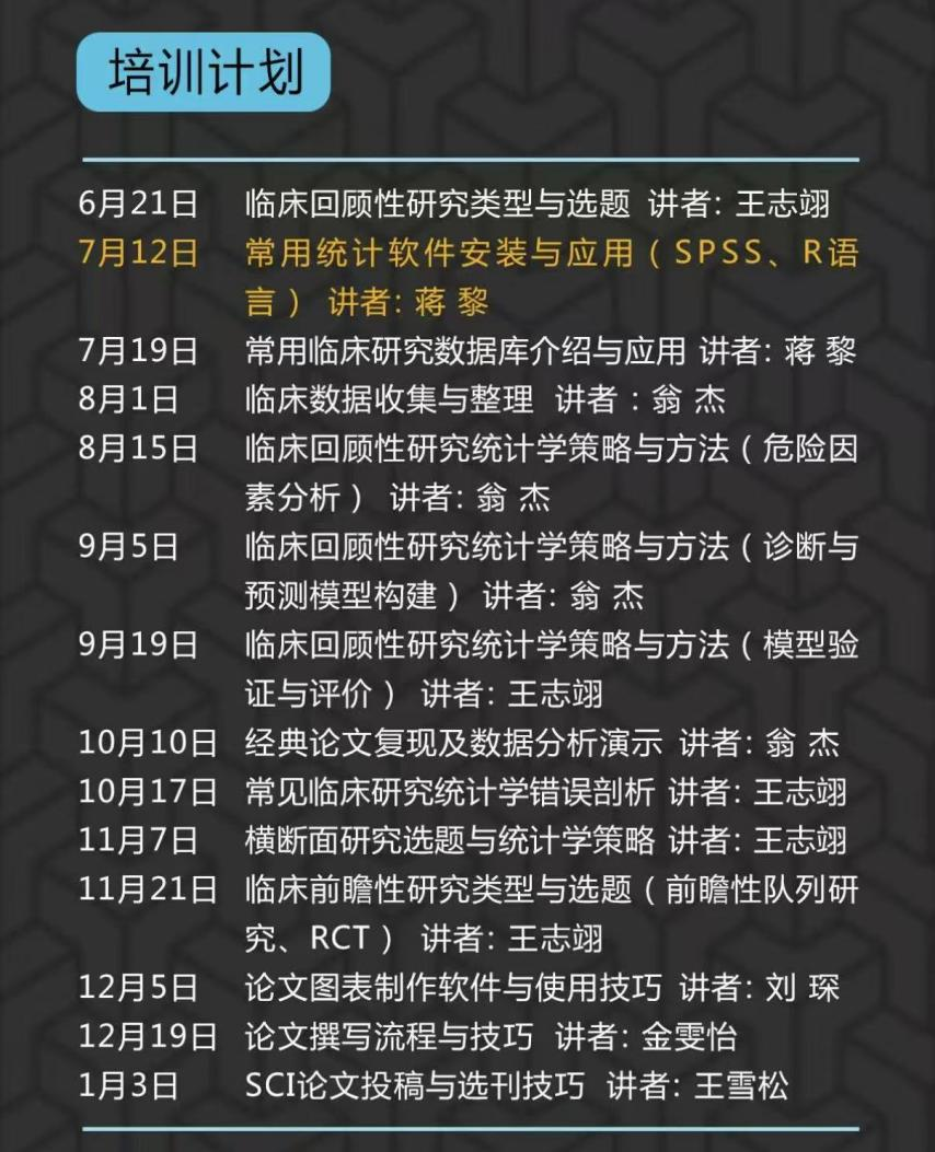 未来,科研联盟将每月定期举办2期科研学习,共计14讲,课程至2026年初结束。课程内容涵盖临床回顾性研究类型与选题、常用统计软件安装与应用(SPSS、R语言)、常用临床研究数据库介绍与应用、临床数据收集与整理、临床回顾性研究统计学策略与方法、经典论文复现及数据分析演示、常见临床研究统计学错误剖析、横断面研究选题与统计学策略、临床前瞻性研究类型与选题、论文图表制作软件与使用技巧、论文撰写流程与技巧、SCI论文投稿与选刊技巧等内容。