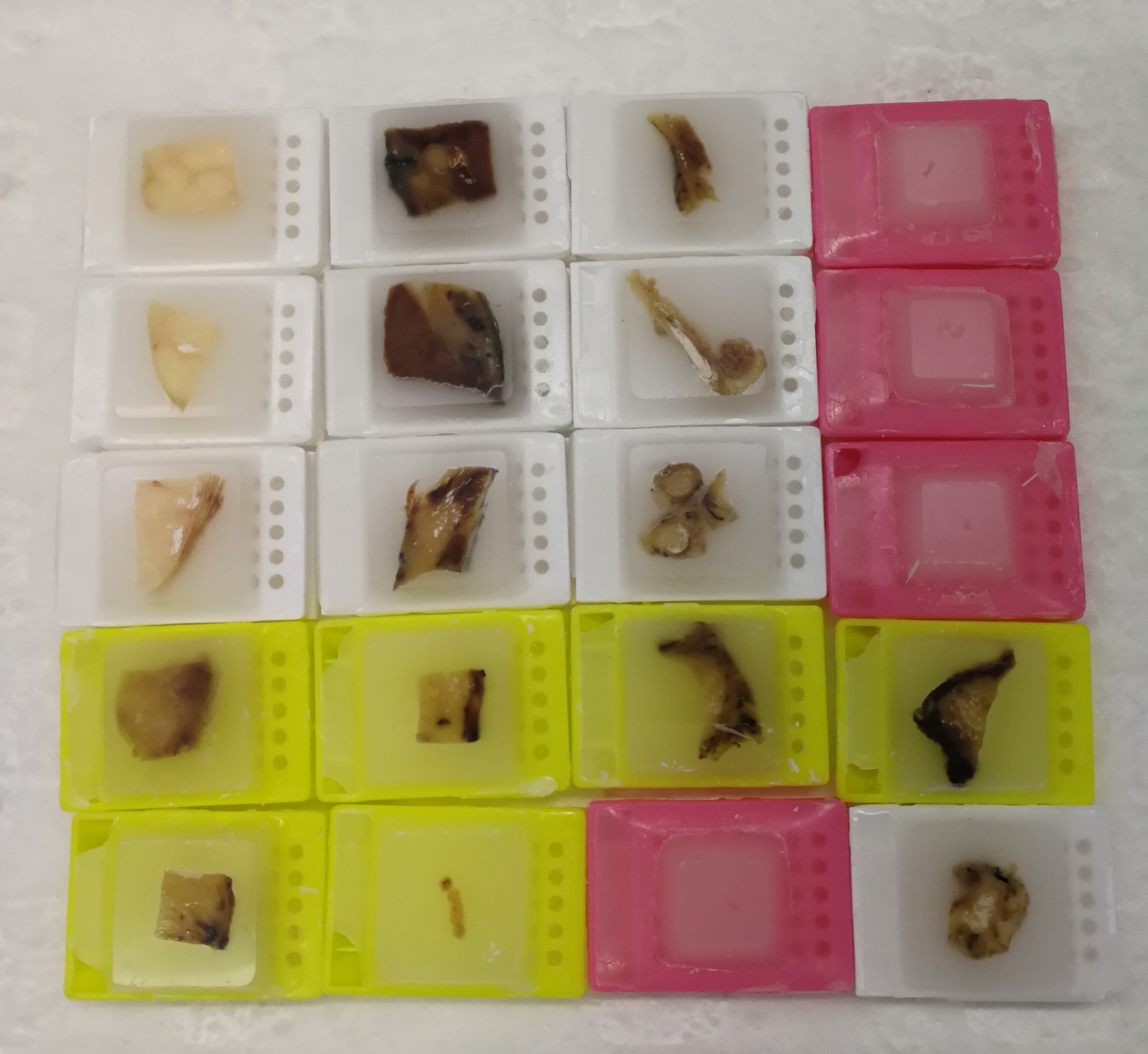 (注:左侧为包埋后的组织蜡块,右侧为蜡块与其制备完成后的切片对比)