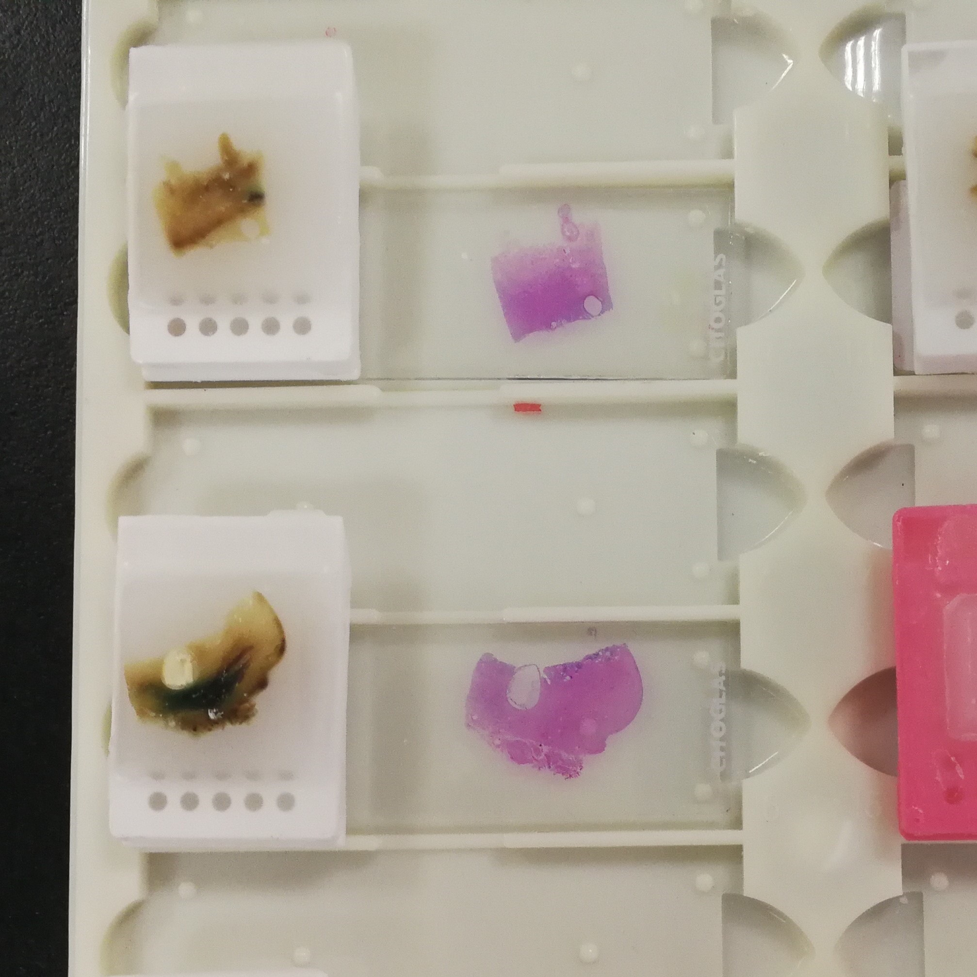 4.包埋、切片、染色和封片:包埋是指将浸蜡后组织放入包埋的模具中,经过石蜡与组织的冷却融合,做成组织蜡块。切片是将组织蜡块在切片机上切成厚3-5微米的组织蜡片,并贴在载玻片上,其后经过烤片机烘烤,使组织粘附在载玻片上。切片后的组织因其没有颜色,无法在显微镜下辨别细胞的形态结构,需要将切片经过十几道试剂的处理来完成染色,包括脱蜡、脱苯和常规苏木素-伊红(HE)染色等,耗时约1个小时左右。染色后的切片,细胞中不同成分会染成不同的颜色,滴上中性树胶并盖上盖玻片进行封片后就完成了制片的整个操作。目前包埋及切片步骤为病理技师手工操作,染色及封片步骤可用相应自动化机器完成,制作后的切片可供病理医师在显微镜下进行观察。