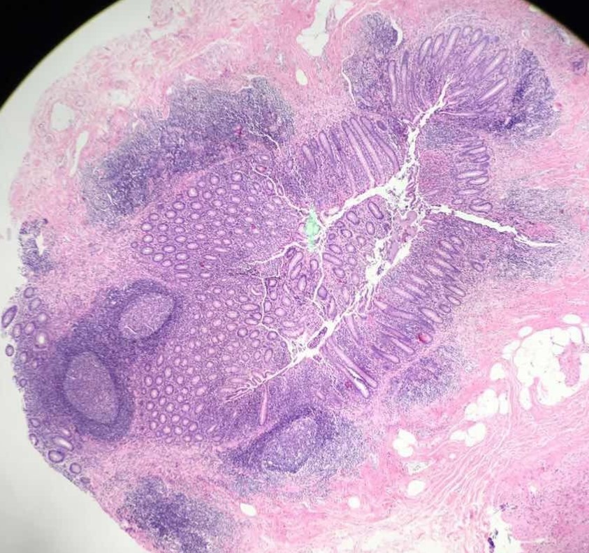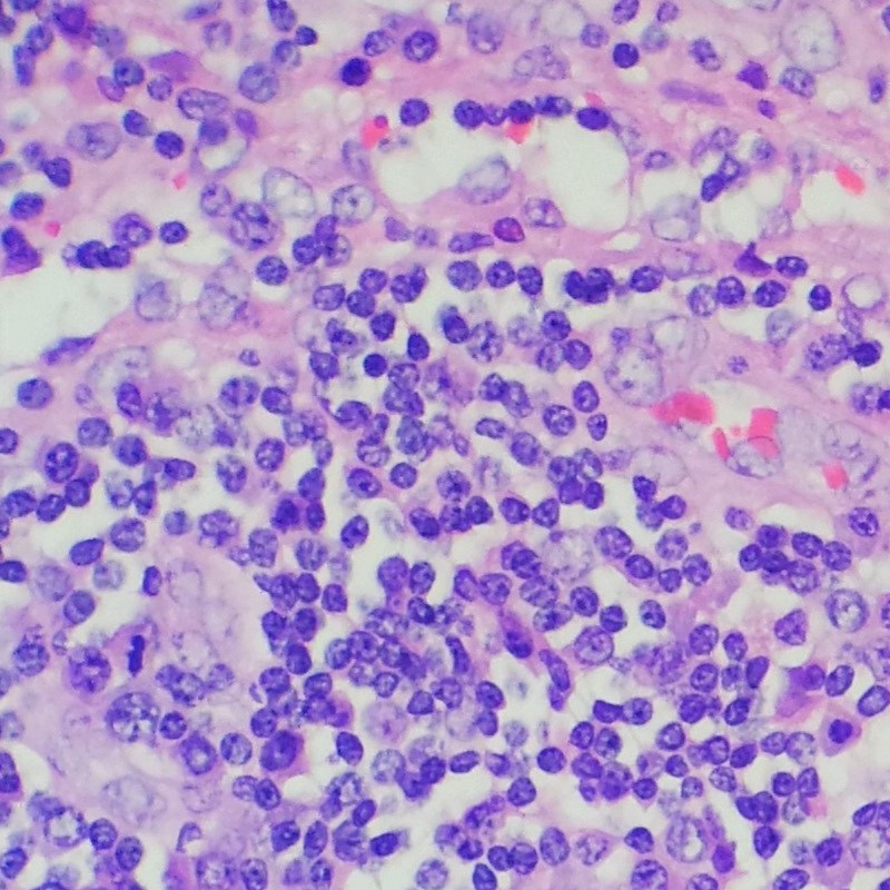 (注:病理医师在显微镜低倍与高倍镜下观察到的两张不同病理切片的图像)
