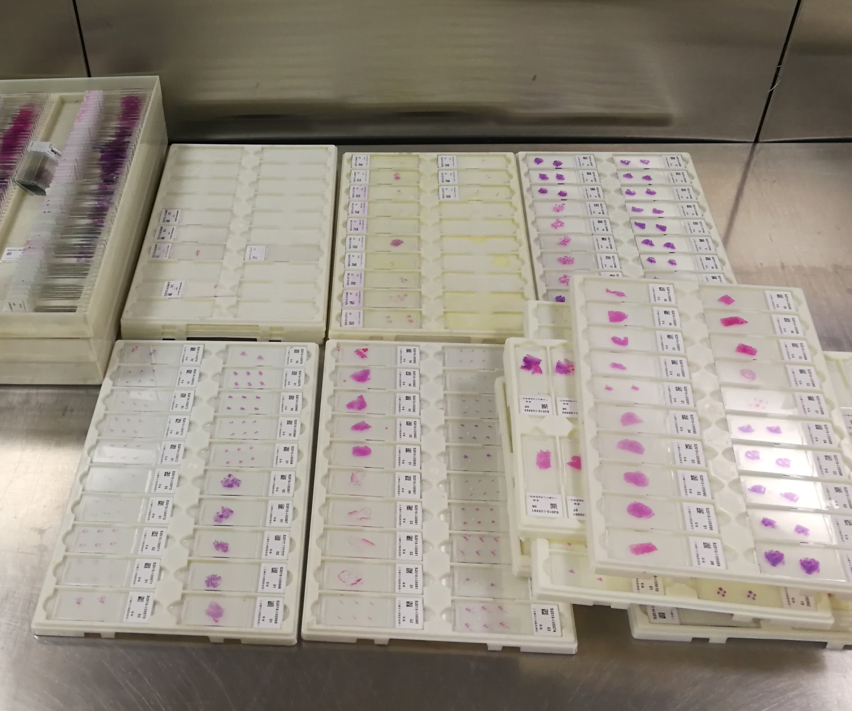 1.标本收件:收到标本后,病理科工作人员需要将标本与申请单信息进行逐一核实,包括患者的姓名、年龄、病历号、标本内容、标本数量、标本固定状态等,确认无误后将通过电脑系统创建绝对不变且唯一的病理编号,并将收件过程发现的问题标本进行退件。所谓“失之毫厘,谬以千里”,信息的核对在病理科全流程工作中都不可或缺,标本收件也是病理科质量控制的第一道关口。
