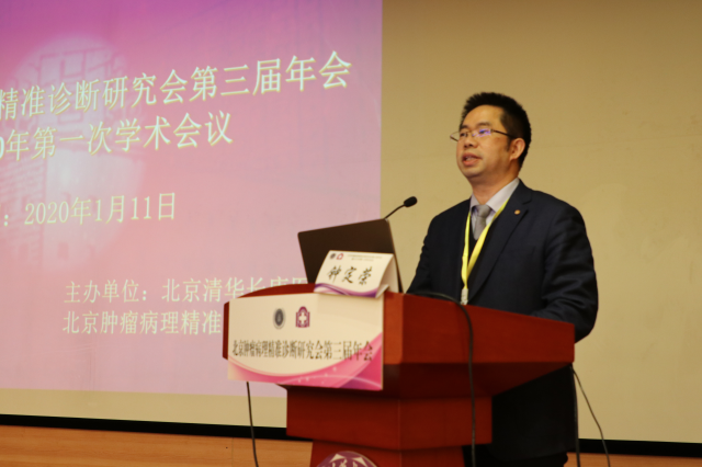 接着是北京肿瘤病理精准诊断研究会会长、中日友好医院病理科主任钟定荣教授致辞:北京肿瘤病理精准诊断研究会成立于2017年8月,研究会旨在团结肿瘤诊断、治疗的相关医疗人员和相关企业,通过开展肿瘤宣教、多学科讨论、远程高端会诊及肿瘤诊断研究等主要活动,提高对肿瘤精准诊断认识,促进精准诊断领域的发展。