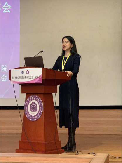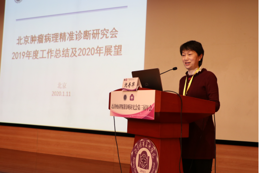 然后北京肿瘤病理精准诊断研究会副会长、北京大学人民医院病理科主任沈丹华教授做了北京肿瘤病理精准诊断研究会2019年度工作总结及2020年展望,对于积极举办参会的各位委员、理事单位表示了衷心的感谢,并希冀新的一年能携手共进,开创更加美好的明天。