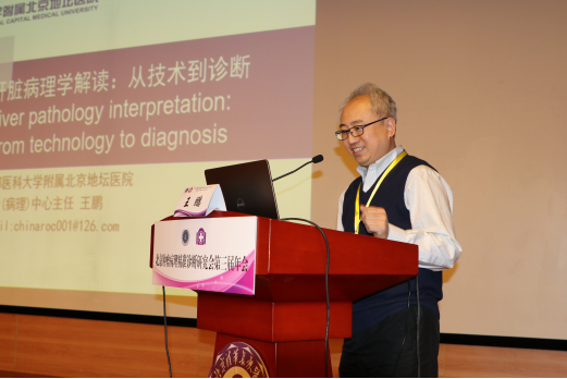 会议进入精彩的学术讲座阶段,北京地坛医院检验中心主任王鹏教授作了题为《肝胆病理学解读:从技术到诊断》的报告,王鹏教授从肝脏活检的适应症和基本技术以及组织学结构及染色分析方法到肝脏常见疾病的诊断特点及分子病理技术在肝脏病理诊断中的价值作了全面的介绍,强调说:肝脏疾病病因复杂、类型多样,其精准诊断需要完整的临床病史、借助多种染色方法和丰富的临床经验,分子病理学为肝脏疾病精准诊断提供了新的诊断方法。
