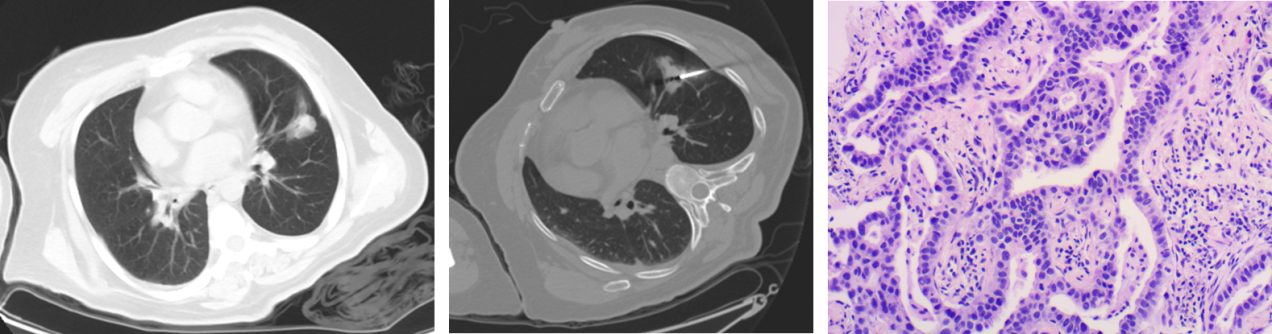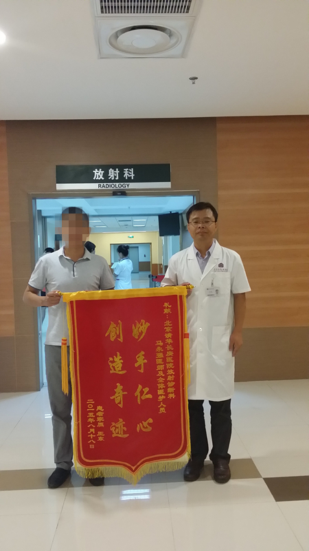 北京清华长庚医院8月27日电(通讯员 董鸿鹏)患者系老年女性,因“腰腿痛半年,加重三个月”于外院拟行腰椎间盘突出症手术治疗。术前胸片发现左肺阴影,胸部CT提示“左肺团片影,慢性炎症可能性大,占位性病变不除外,建议抗炎治疗后复查”。患者于2015年5月初来我院“影像介入门诊”就诊,放射科马永强医师阅片后考虑病变肺癌可能性大,建议穿刺活检明确诊断。征得患者及家属同意后,马永强医师为患者左肺病灶行CT引导下穿刺活检,术后病理提示“浸润性腺癌,外院PET-CT全身扫描提示“左肺上叶舌段占位,FDG摄取增高,最大SUV3.6,同时发现L5棘突骨转移,属肺癌晚期,无手术切除机会。在征得患者及家属同意后,马永强医师于2015年5月中旬为患者行肺癌射频消融术治疗,手术顺利,无并发症发生,患者术后2个月外院PET-CT复查提示:左肺肿块接近消失,仅残留少许纤维条索,FDG无摄取。治疗效果显著,患者及家属送来锦旗表示感谢。