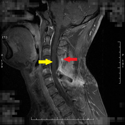 患者小康(化名)今年26岁,2013年查出椎管内肿瘤并进行切除,2015年12月复发来我院就诊,经神经外科医师评估后再次行切除术,病理报告为间变型血管周细胞瘤。术后三个月复查,核磁共振扫描提示:C5-C6(“C”代表颈椎)水平椎管内硬膜外左侧及C5/6左侧椎间孔区仍可见实性强化影,考虑为肿瘤病变,建议行术后放射治疗。