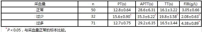 采血时止血带不应扎得太紧或时间太长,因长时间会使因子Ⅷ和组织纤溶酶源激活剂(t-PA)释放并活化。采血时穿刺不顺或反复穿刺会损伤血管和组织,使组织因子入血,促使凝血酶形成而影响结果准确性。标本采集量也会影响凝血项目的准确性。凝血检测所用的是抗凝剂与标本比例为1:9的枸橼酸钠抗凝管,如果采集量过少,抗凝剂相对就多了,会抑制凝血因子活性,导致APTT、TT、PT时间的延长,FIB水平减低;如果采集量过多会是相反的结果吗?有研究[3]表明并非如此,采集量过多,对APTT、TT、PT无明显影响,但是会使FIB明显升高,此研究结果如下所示: