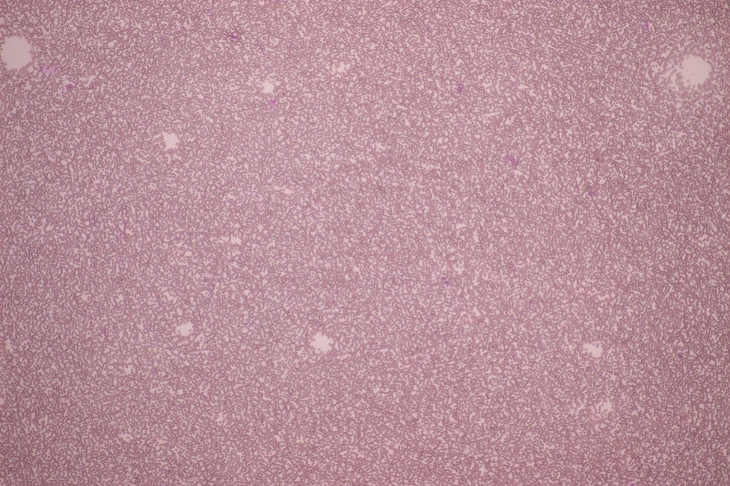 2、手工复检:将两份血标本涂片后人工镜检,涂片结果与仪器报告基本一致。显微镜下可见5.24日样本中性粒细胞(NEU)明显增多,杆状核占16%,分叶核占80%,淋巴细胞占3%(图1))。