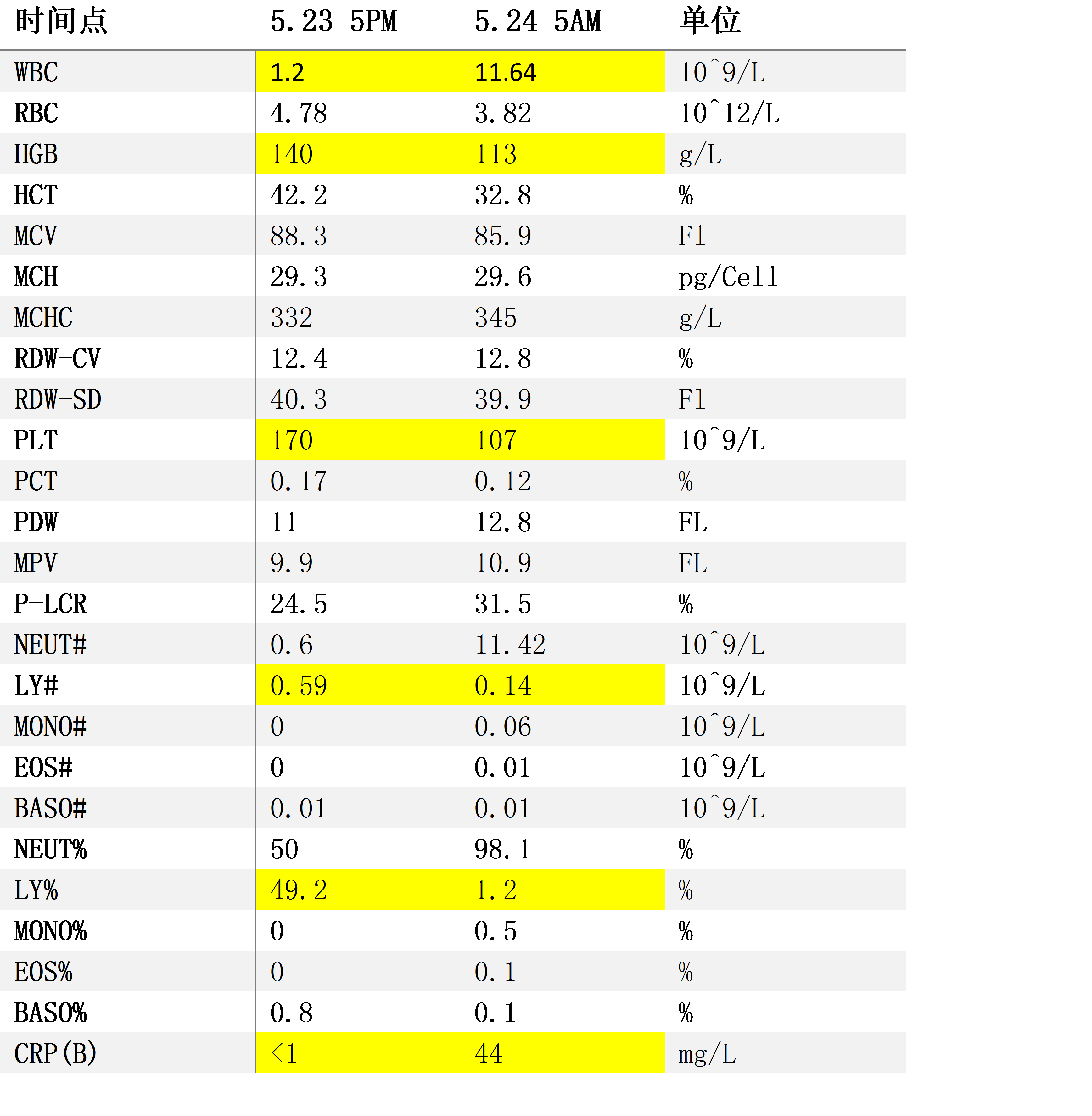 分析:这是一例因严重炎症反应导致WBC短时间内下降的案例。